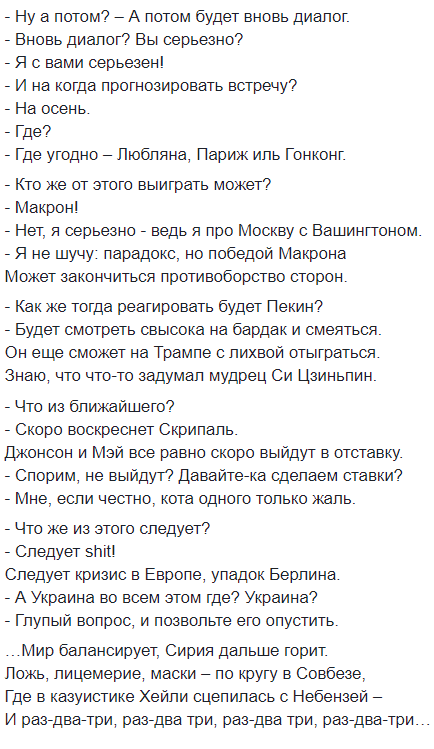 23:35  "Мне кто-нибудь может членораздельно объяснить, зачем Асаду нужна была эта химическая атака, когда большинство боевиков на тот момент уже покинуло Думу?" – Небензя.