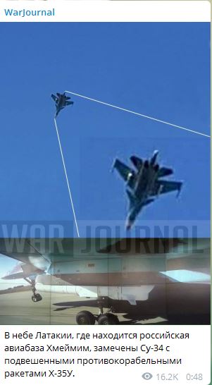 "В небе Латакии, где расположена российская авиабаза Хмеймим, замечены Су-34 с подвешенными противокорабельными ракетами Х-35У", – говорится в сообщении.