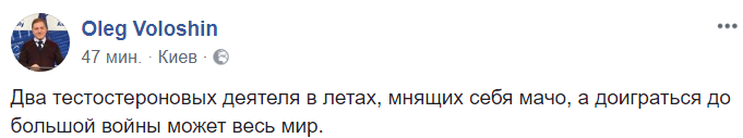 "Два тестостероновых деятеля в летах, мнящих себя мачо, а доиграться до большой войны может весь мир", – пишет политолог Олег Волошин.