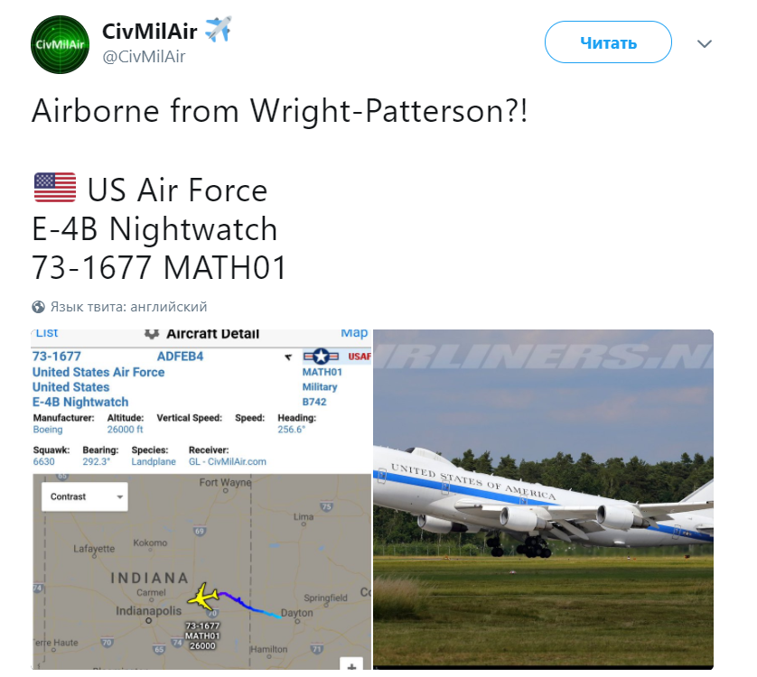 16:24  США подняли в воздух E-4B Nightwatch, известный как "самолет судного дня", следует из данных, опубликованных мониторинговым ресурсом CivMilAir.