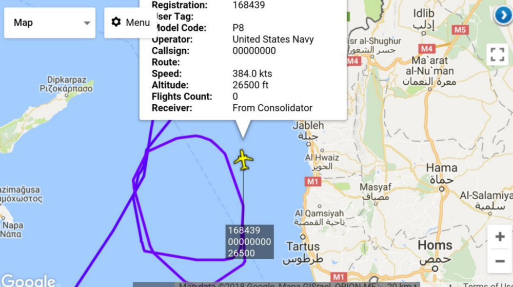 15:00  Патрульный противолодочный самолет Boeing P-8 Poseidon кружит над побережьем Сирии.