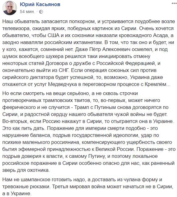 20:15  "Трамп с Путиным снова договорятся по Сирии, и радостной сердцу нашего обывателя чужой войны не будет. Во-вторых, если Россию накажут в Сирии, то отыграется она в Украине. Это как пить дать", - пишет в Facebook волонтер Юрий Касьянов.