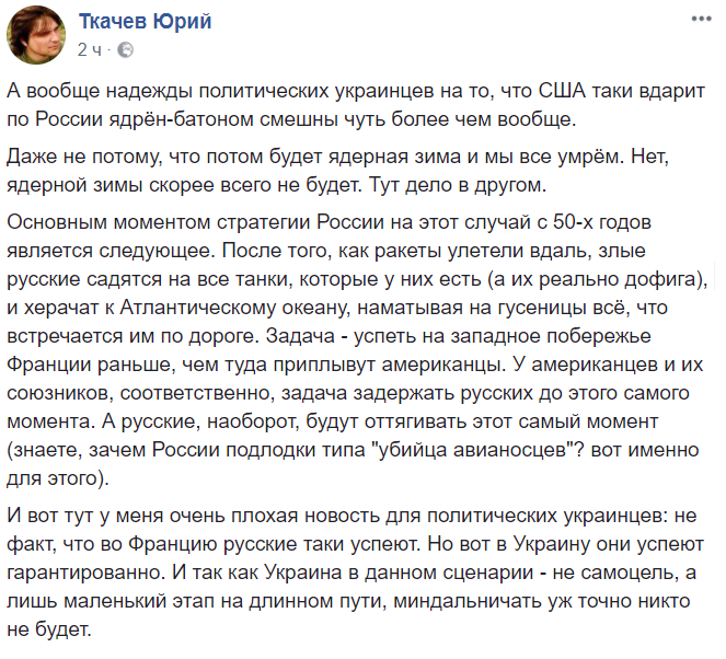17:10  Если между США и Россией все же вспыхнет война - первой не поздоровится Украине, пишет в Facebook журналист Юрий Ткачев.
