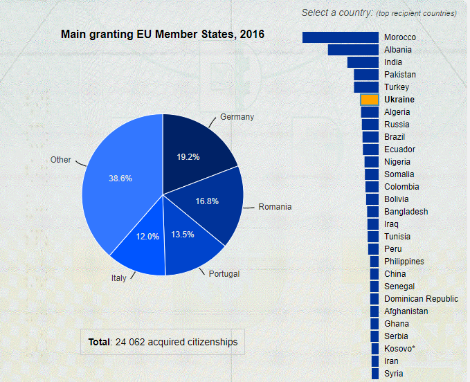 Среди стран, не являющихся членами ЕС, Украина оказалась на шестом месте по количеству полученных гражданств. По данным отчета, в 2016 году гражданство ЕС получили 24062 украинца.