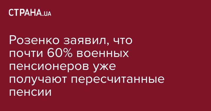Около 316 тысяч (60%) военных пенсионеров уже получают пересчитанные пенсии. Об этом сообщил вице-премьер-министр Украины Павел Розенко, пишет Интерфакс-Украина.