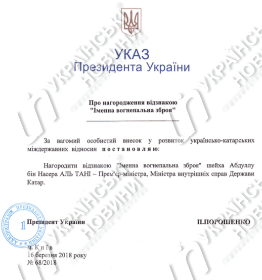Президент Петр Порошенко наградил премьер-министра Кувейта и премьер-министра Катара именным огнестрельным оружием.