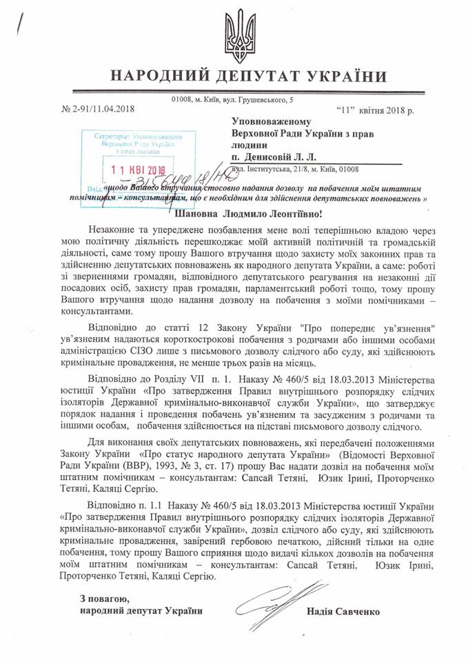 Кроме того, Савченко в своем письме Денисовой просит уполномоченного Верховной Рады по правам человека поспособствовать предоставлению нескольких разрешений на свидание с ее помощникам.