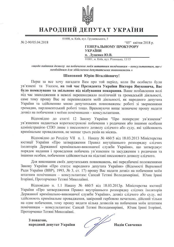 В письме, адресованном генеральному прокурору, Савченко просит не препятствовать ее деятельности как народного депутата и предоставить разрешение на свидание с ее помощниками-консультантами.