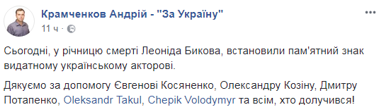 "Сегодня, в годовщину смерти Леонида Быкова, установили памятный знак выдающемуся украинскому актеру", - написал депутат Сумского городского совета Андрей Крамченков.