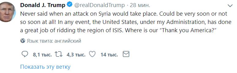 "Никогда не говорил, когда произойдет нападение на Сирию. Может быть очень скоро, или совсем не скоро! В любом случае Соединенные Штаты, под управлением моей Администрации, проделали большую работу по избавлению региона от ИГИЛ. Где наше "Спасибо Америке?" - говорится в сообщении.