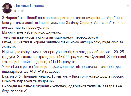 "Итак, 13 апреля в Украине благодаря северо антициклона будет сухо и солнечно. Самой ожидается температура воздуха в западных областях, + 20 ... + 25 градуса. В общем завтра днем +15... + 22 градуса. На Сумщине, Харьковщине, Луганщине - холоднее, + 11... + 14 градусов. В Киеве завтра, в пятницу, - сухо солнечно, ветер стихнет, температура повысится до +18, +19 градусов. Важно. В Проводное воскресенье, 15 апреля, в Киеве ожидается дождь с грозой. Возьмите зонты и дождевики", - написала она.