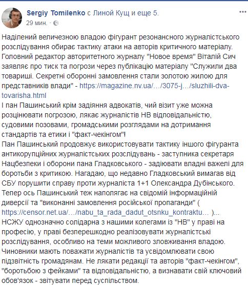 "Фигурант резонансного журналистского расследования выбирает тактику атаки на авторов критического материала. Главный редактор авторитетного журнала "Новое время" Виталий Сыч заявляет о давлении и угрозах за публикацию материала "Служили два товарища. Секретные оборонные заказы стали золотой жилой для представителей власти". И господин Пашинский кроме задействования адвокатов, чей визит уже можно расценивать угрозой, пугает журналистов НВ ответственностью, судебными исками, общественными разбирательствами на соблюдение стандартов и этики и "факт-чекингом"!" - пишет Томиленко.