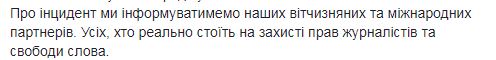 "НСЖУ однозначно солидарна с нашими коллегами из "НВ" в праве на профессию, в праве беспрепятственно реализовывать журналистские расследования, особенно на темы возможного злоупотребления властью. Чиновники должны уважать журналистов и осознавать свою подотчетность гражданам. Не пугать редакции и авторов "борьбой с фейками" и ответственностью, а признавать свой ключевой обязанность - отчитываться перед обществом. Об инциденте мы будем информировать наших отечественных и международных партнеров", - отметил Томиленко.