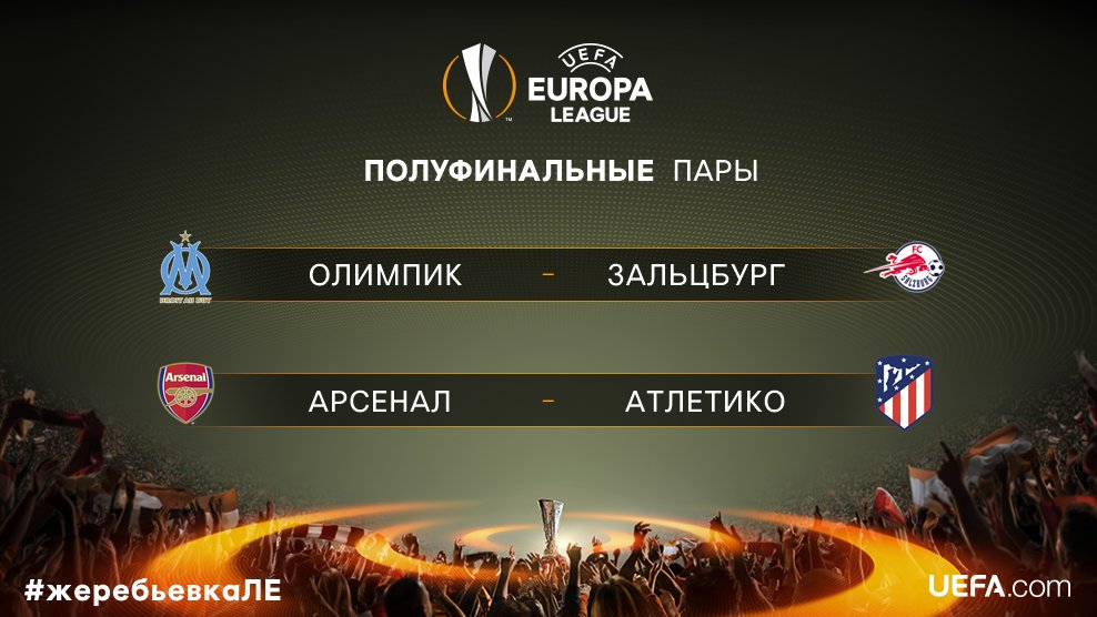В полуфиналах Лиги Европы, которые пройдут 26 апреля и 3 мая, встретятся английский Арсенал и испанский Атлетико, и французский Олимпик с австрийским Зальцбургом. Финал Лиги Европы состоится 16 мая в Лионе.
