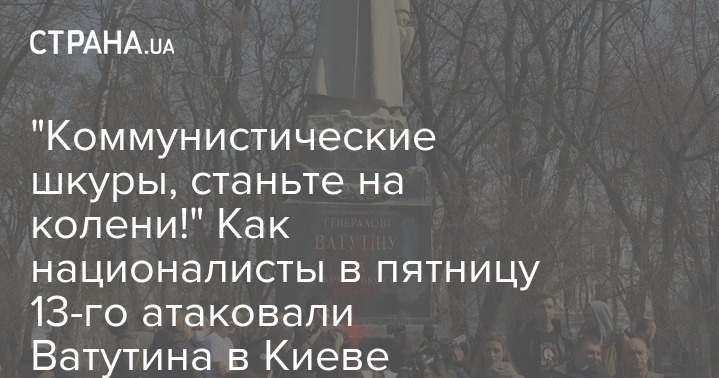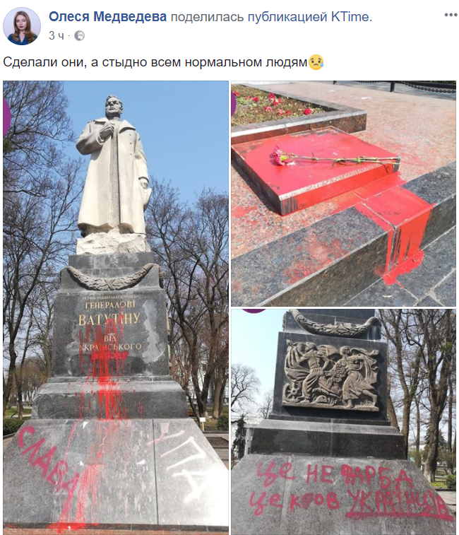 В Киеве националисты открыто осквернили памятник Николаю Ватутину – генералу, который освобождал Киев от нацистов. Они пришли к нему, чтобы сорвать возложение цветов, которое приурочено к очередной годовщине смерти Ватутина. Он погиб 15 апреля 1944 года после ранения в Ровенской области от пули диверсионной группы УПА.