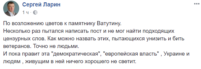 "Несколько отпрысков забитых колхозников с замотанными еб*льниками не дали людям принести цветы к памятнику Ватутину, забрызгали людей газом. До Верховной Рады 200 метров. Полиции нет. В Киеве проходит "Форум по безопасности"... " – пишет журналист Анатолий Шарий в Facebook.