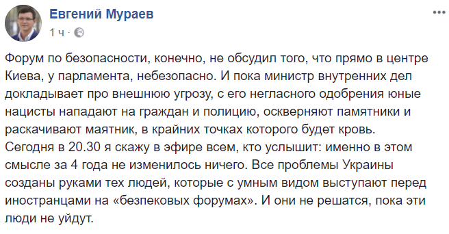 "Форум по безопасности, конечно, не обсудил того, что прямо в центре Киева, у парламента, небезопасно. И пока министр внутренних дел докладывает про внешнюю угрозу, с его негласного одобрения юные нацисты нападают на граждан и полицию, оскверняют памятники и раскачивают маятник, в крайних точках которого будет кровь".
