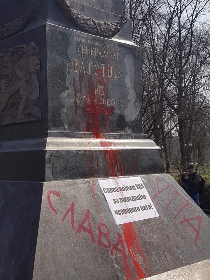 С собой у националистов была краска и громкоговорители. Они сходу облили красной краской памятник, мемориальную табличку у его подножия и наклеили на него "благодарственную" надпись УПА за ликвидацию Ватутина.