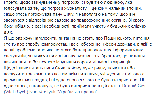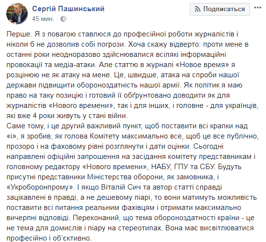 "Статью в журнале "Новое время" я расцениваю не как атаку на меня. Это, скорее, атака на попытки нашего государства повысить обороноспособность нашей армии. Как политик я имею право на такую ​​позицию и готов ее обоснованно доказывать как для журналистов "Нового времени", так и для других, и главное - для украинцев, которые уже 4 года живут в состоянии войны", - написал Пашинский.
