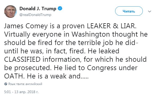 Президент США Дональд Трамп в ответ на публикацию отрывков из книги бывшего директора ФБР Джеймса Коми заявил, что Коми - известный лжец и человек, "сливающий" важную информацию.
