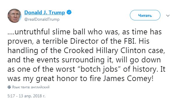 Президент США также назвал Коми "слабым и лживым слизняком", который, "как показало время, был ужасным директором ФБР".