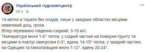 Укргидрометцентр дал прогноз погоды на субботу, 14 апреля. Об этом сообщается на странице метеорологов в Facebook.