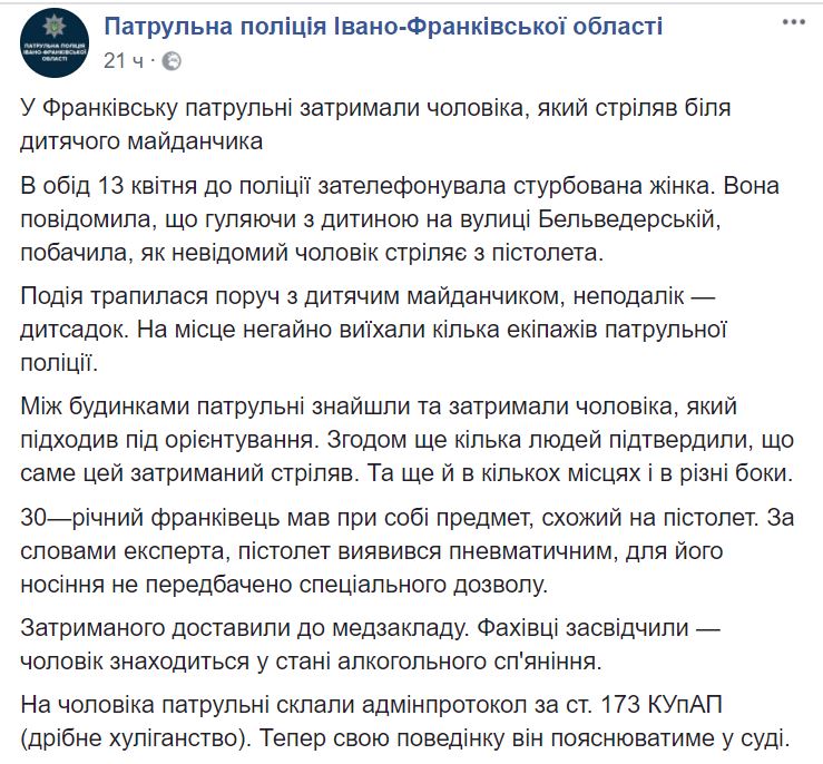 В Ивано-Франковске полицейские задержали местного жителя, который открыл хаотичную стрельбу из пистолета на улице неподалеку от детского сада. Об этом сообщает патрульная полиция Украины на странице в Facebook.