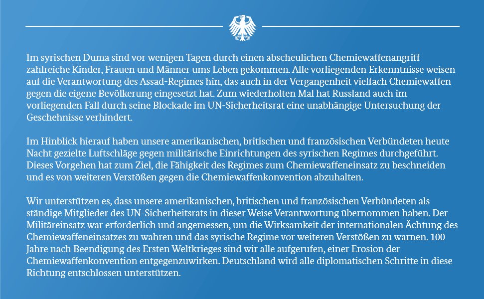Германия поддержала совместный авиадуар США, Великобритании и Франции в Сирии. Об этом в Twitter сообщил представитель правительства Штеффен Зайберт, опубликовав заявление канцлера Ангелы Меркель.