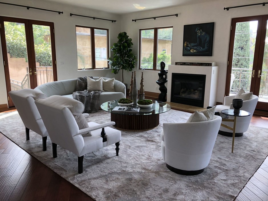 Этажом ниже находится большая гостиная (она же по совместительству столовая) с двумя каминами и огромным балконом. Также в доме есть полностью оборудованная кухня с барными стойками, тренажерный зал, кабинет, домашний кинотеатр и собственный винный погреб.