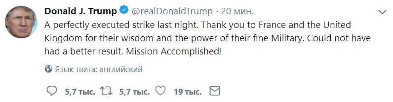 Президент США Дональд Трамп прокомментировал в Twitter ракетный удар по Дамаску, который был нанесен в ночь на 14 апреля.