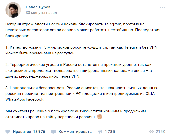 Он предупредил, что без использования VPN-сервисов, которые позволяют обходить блокировку, Telegram может быть временами недоступен.