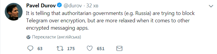 В Twitter он заявил, что "страны с авторитарным режимом, например, Россия блокируют Telegram из-за ключей шифрования, но "более расслаблены", когда дело касается других зашифрованных мессенджеров".