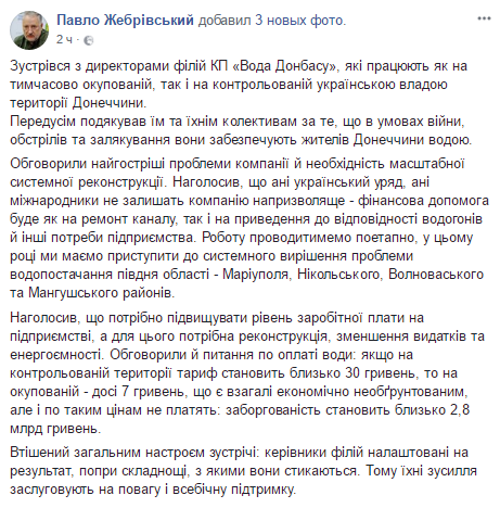 "Если на контролируемой территории тариф составляет около 30 гривень, то на оккупированной - до сих пор 7 гривень, который является вообще экономически необоснованным, но и по таким ценам не платят: задолженность составляет около 2,8 млрд гривень", - написал  Жебривский на своей странице в соцсети Facebook в понедельник по итогам встречи с директорами филиалов коммунального предприятия "Вода Донбасса".