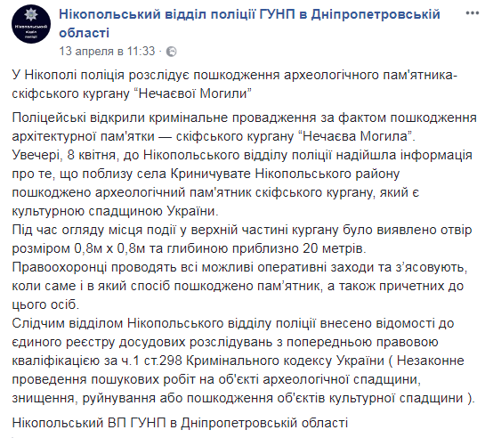 "В никопольский отдел полиции поступила информация о том, что возле села Криничуватое Никопольского района поврежден археологический памятник скифского кургана, который является культурным наследием Украины. Во время осмотра места происшествия в верхней части кургана было обнаружено отверстие размером 0,8м х 0,8м и глубиной приблизительно 20 метров", - указано в опубликованном сообщении.