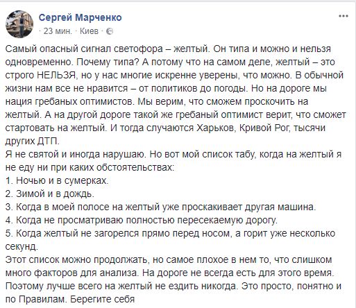 Блогер Сергей Марченко написал пост на эту тему: "Самый опасный сигнал светофора – желтый. Он типа и можно и нельзя одновременно. Почему типа? А потому что на самом деле, желтый – это строго НЕЛЬЗЯ, но у нас многие искренне уверены, что можно. В обычной жизни нам все не нравится – от политиков до погоды. Но на дороге мы нация гребаных оптимистов. Мы верим, что сможем проскочить на желтый. А на другой дороге такой же гребаный оптимист верит, что сможет стартовать на желтый. И тогда случаются Харьков, Кривой Рог, тысячи других ДТП.