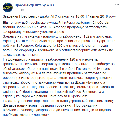 "С начала суток российско-оккупационные войска осуществили 21 обстрел позиций Вооруженных сил Украины. Агрессор продолжает применять запрещенное Минскими соглашениями оружие. (…) К сожалению, вследствие вражеского огня один украинский защитник погиб. Еще двое наших воинов получили ранения", - говорится в сводке штаба на странице в Facebook.