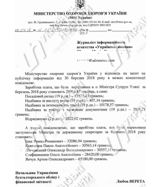 Сумма средств, начисленная Супрун в марте, составила 29 015 гривен, из которых должностной оклад составляет 13 571 гривну, надбавка за выслугу лет - 407 гривен, надбавка за интенсивность труда - 10 179 гривен, надбавка за роботу с секретными документами - 2 036 гривен, командировочные - 2 822 гривны.