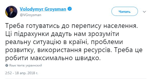 "Надо готовиться к переписи населения. Эти подсчеты дадут нам понять реальную ситуацию в стране, проблемы развития, использования ресурсов. Надо это делать максимально быстро", - сообщил Гройсман.