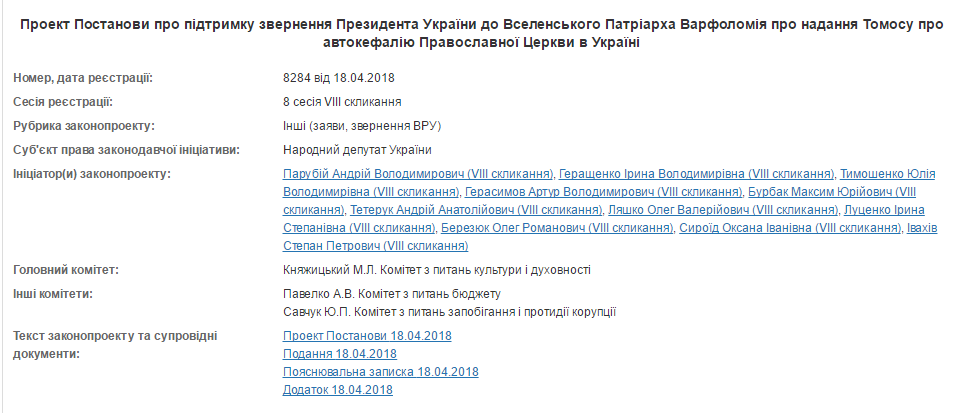 В Верховной Раде зарегистрирован проект постановления о поддержке обращения президента Украины Петра Порошенко к Вселенскому патриарху Варфоломею о предоставлении томоса об автокефалии православной церкви в Украине.