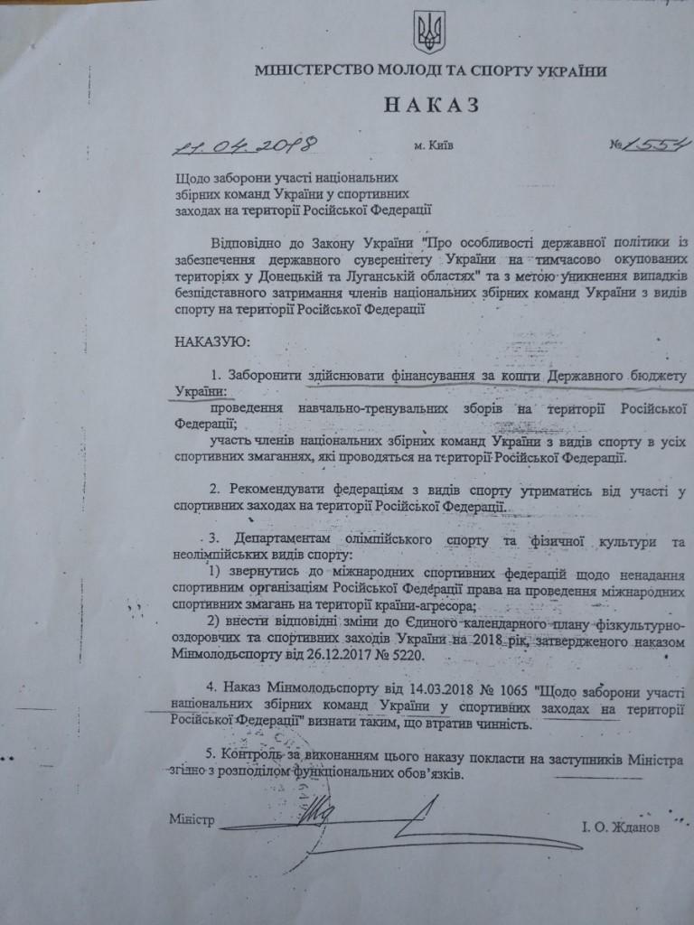 Ранее "Страна" информировала, что министр Жданов 14 апреля полностью запретил украинским спортсменам выступать в России.