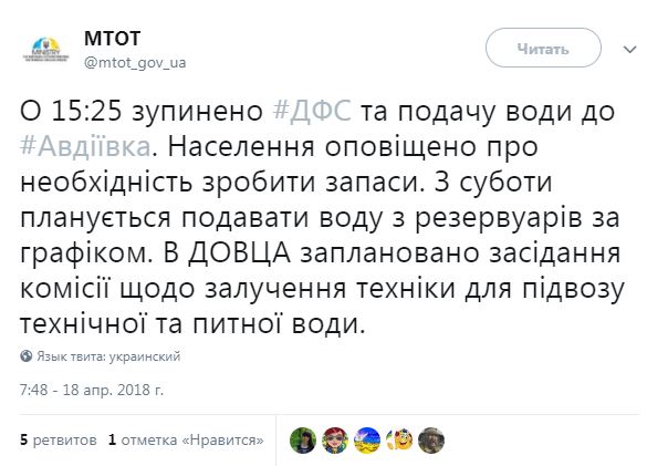"В 15.25 остановлена ДФС и подача воды в Авдеевку. Население уведомлено о необходимости сделать запасы. С субботы планируется подавать воду из резервуаров по графику", - говорится в сообщении.