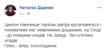 Об этом сообщила синоптик Наталья Диденко в Facebook.