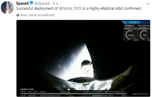"Успешное выведение TESS на высокую эллиптическую орбиту подтверждено", - написали в SpaceX.