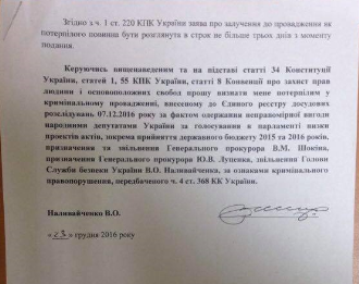 Национальное антикоррупционное бюро Украины осуществляет уже почти полтора года досудебное расследование в уголовном производстве №52016000000000466 от 07.12.2016 года по факту получения неправомерной выгоды народными депутатами Украины за голосование в парламенте ряда законопроектов, в частности принятие государственного бюджета 2015 и 2016, назначения и увольнения Генерального прокурора Шокина, назначение Генерального прокурора Луценко, освобождение Председателя Службы безопасности Украины Наливайченко, по признакам уголовного преступления, предусмотренного ст.368 Уголовного кодекса Украины.
