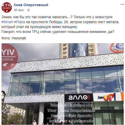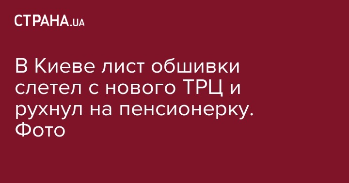 При этом пострадала проходившая мимо пенсионерка, которую ударило железным листом по голове. Об этом говорится в сообщении ресурса Киев Оперативный в Facebook.