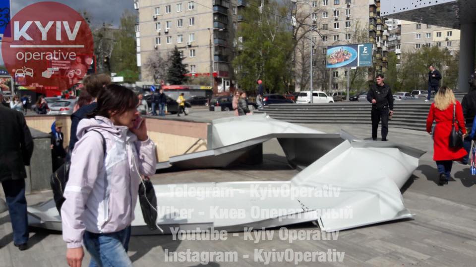 Сегодня, 19 апреля, в Киеве на проспекте Победы напротив станции метро "Политехнический институт" порывами сильного ветра сорвало железные листы и перекрытия с нового торгово-развлекательного центра "Смарт Плаза".