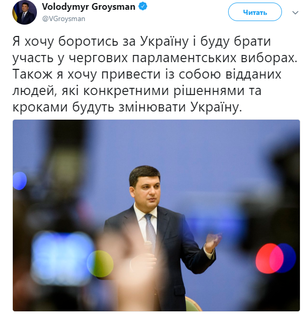 "Я хочу бороться за Украину и буду участвовать в очередных парламентских выборах. Также я хочу привести с собой преданных людей, которые конкретными решениями и шагами будут менять Украину", – заявил Гройсман.