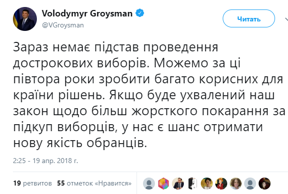 "Сейчас нет оснований для проведения досрочных выборов. Можем за эти полтора года сделать много полезных для страны решений. Если будет принят наш закон о более жестком наказании за подкуп избирателей, у нас есть шанс получить новое качество избранников", - считает Гройсман.