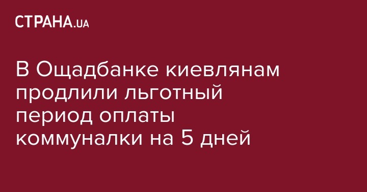 "Ощадбанк" договорился с Киевской государственной городской администрацией продлить льготный период оплаты коммунальных платежей до 25 мая. Таким образом финансовое учреждение хочет разгрузить столичные отделения банка в пиковые дни, сказано на сайте "Ощадбанка".