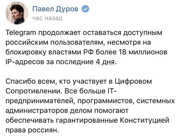 "Телеграм продолжает оставаться доступным российским пользователям, несмотря на блокировку властями РФ более 18 млн IP-адресов за последние четыре дня", - написал Дуров в четверг.